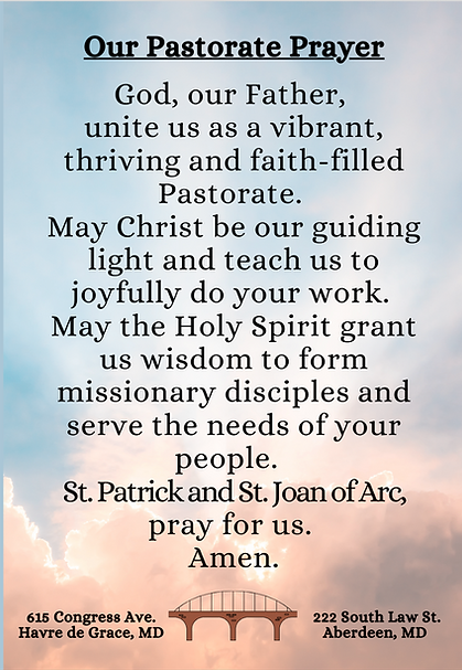 A loving and vibrant catholic pastorate of St. Patrick and St. Joan of Arc, united as missionary disciples, to help all encounter our Lord, Jesus Christ.